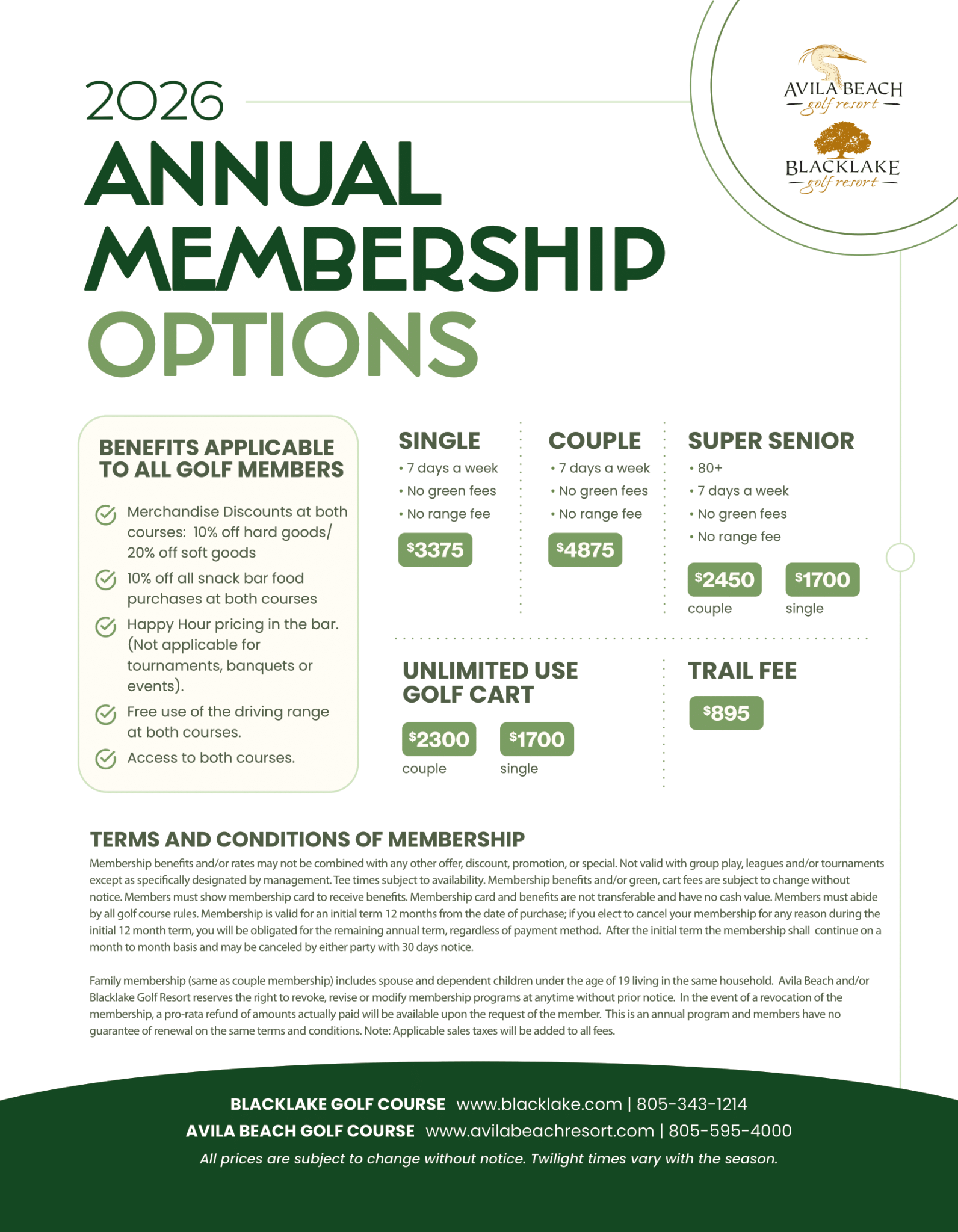 Family membership (same as couple membership) includes spouse and dependent children under the age of 19 living in the same household. Avila Beach and/or Blacklake Golf Resort reserves the right to revoke, revise or modify membership programs at anytime without prior notice. In the event of a revocation of the membership, a pro-rata refund of amounts actually paid will be available upon the request of the member. This is an annual program and members have no guarantee of renewal on the same terms and conditions. Note: Applicable sales taxes will be added to all fees.
